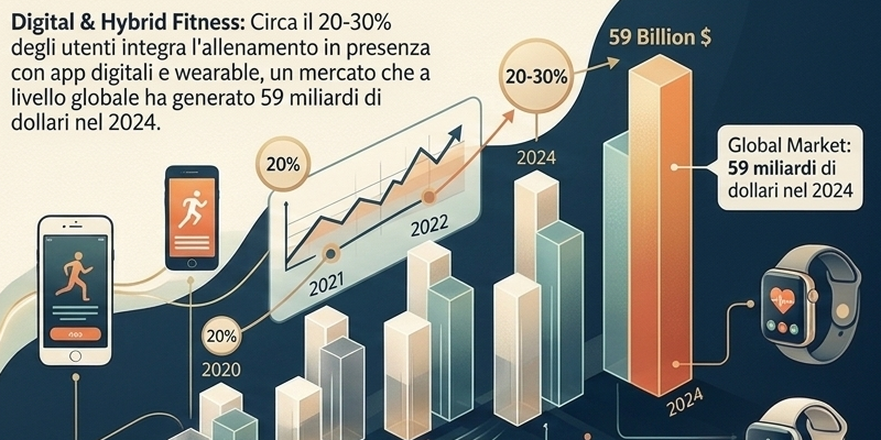 Parallelamente a questa espansione fisica, stiamo assistendo all’ascesa inarrestabile del Digital & Hybrid Fitness. Non esiste più una barriera netta tra l’allenamento in sala e quello domestico, poiché ormai circa il 20-30% degli utenti integra costantemente la propria attività in presenza con l’uso di app dedicate e dispositivi wearable. Questa tendenza ha trasformato il sudore in dati, creando un mercato globale che nel solo 2024 ha generato l’incredibile cifra di 59 miliardi di dollari.